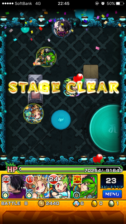 最終ステージはたまたまベスポジにバフ状態のキャラを1体配置出来ていたのでループヒットにてゲージ全て削ってフィニッシュ。