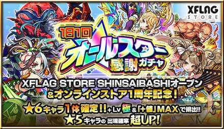 XFLAG STORE SHINSAIBASHIのオープンとオンラインストアの1周年を記念して本日より3日間お一人様1日1回限りの☆6が1体確定且つ、進化or神化or獣神化のどれかの状態で排出されるオールスター感謝ガチャが実装されました。