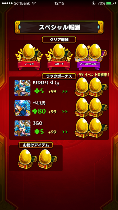 全てのキャラがラック99扱いになるので運極を連れて行く必要はありません。つまり、マルチの恩恵を最大限に受ける仕組み。ソロでやるには不向きなので出現したら周りの友人、知人を誘ってやりましょう。至宝のパワーも効果的ですよ。