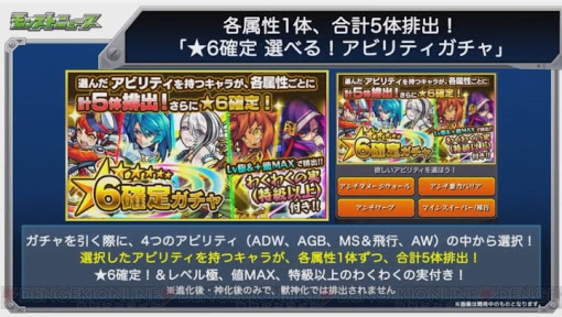アビリティガチャ実装。好きなアビリティを選んで引くと各属性1体ずつ排出されるみたいです。初心者応援パックも復活されるとの事。