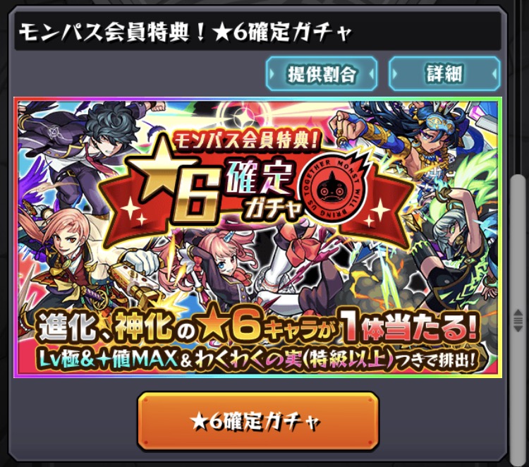 3ヶ月毎にやって来るモンパス会員限定ガチャが配布されました。無料で引けるお得なガチャに加えて進化or神化後の状態で実まで付いて排出されます。