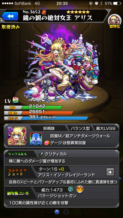 従来の神化に比べてHPと攻撃力は約600UPにスピードは20UPしました。ステータス面はボチボチって感じですよね。
