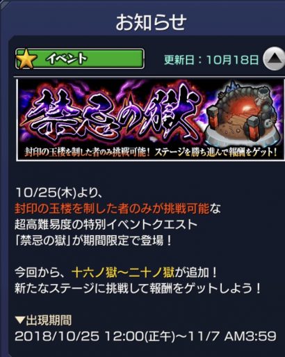 本日より禁忌の獄が始まりました。もう始まりましたね…。オラコイン周回したいのに。しかも、今回より新たに二十ノ獄まで追加されました。マジかぁ(-_-)