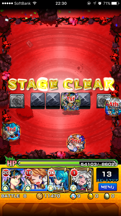 木曜のラストを締めくくるのは轟絶シュリンガーラ。すでに運極の猛者が居る中で私の周りでシュリンガーラを獣神化しているのは僅か2名のみ(-_-) 最低10体居ないと獣神化出来ません。