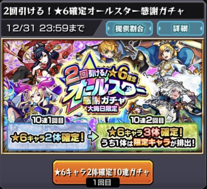 2018年最終日。日付が変わると同時にオールスター感謝ガチャが実装されました。新年の超獣も良いですが感謝ガチャは爆死が無いのが◎