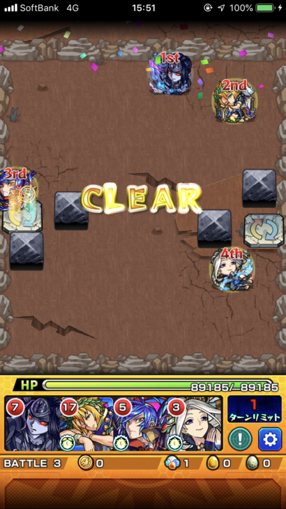 5ステは貫通制限だらけ。オマケに蘇生しまくるから厄介。周りの制限雑魚片付けて中心のドクロ雑魚に辿り着くスピードが勝負でした。デトラビと弁財天の大活躍により今回も初日攻略完了(^ ^)