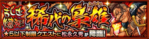新イベ降臨はこれにて終了(゚∀゚) 周回するのに適性90がなかなか居ないって人は今のイベントキャラの佐助を作って周ると良いですよ。 ちなみに松永久秀は新爆絶サキミタマの枠としても優秀なのでまだの人にはオススメです。