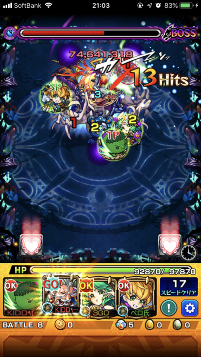 まだまだ下手くそにつき安全に運1での周回。キャラをバラけさせると感染喰らわないのは有難いですね。個人的カルナのイチ押しであるベテルギウスが毎度の事ながら便利すぎて重宝してます(^ ^) 最終はゲージフルでも持って行ってくれるのでボス単体になってしまえば勝ち確。