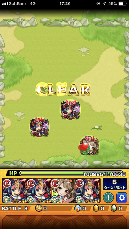 4ステは木なので、なるべく火属性で固めましょう。反射パで複数体の同時処理が求められます。卑弥呼がベストでしょうね。ここはルートを見つけるのにやや苦戦しました。多少雑に弾いた場合でも何とかする為に進化弁財天を1体入れて何とかクリア。