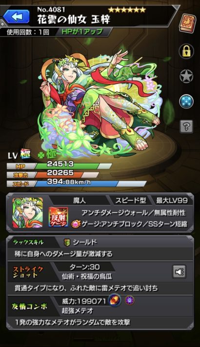 現在イベント開催中の里見八犬伝の激究極キャラ玉梓。明らかにアルマゲドン適正のスペックなので運3で周回すると、どれくらい周りやすいのかを検証。