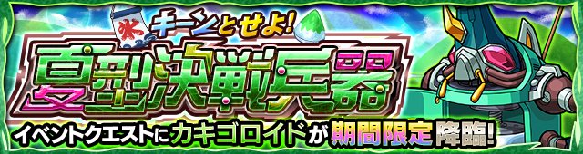 期間限定降臨として夏休みイベントが始まりました。若干遅いのでは?と思いつつも周回する事に。全部で激究極、究極、制限クエ、4〜5クエの4種ですね。初日は先程まで降臨していた通常降臨カキゴロイド。