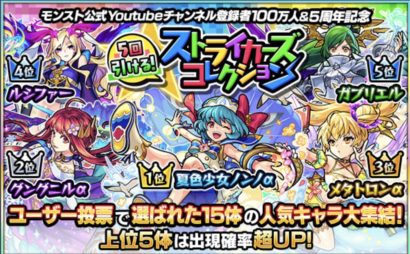 モンストの公式YouTubeチャンネル登録者100万人突破&5周年を記念してユーザー投票にて選抜されたキャラの排出率がUPするストライカーズコレクションなるガチャが始まりました。