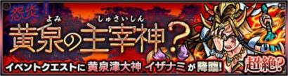 本日正午よりイザナミのイベントが開催されました。ええ。あのイザナミですわ。クエスト内容は全く同じでLV2からLV?までの5段階あり、ステージを進めるにつれて敵のHPと攻撃力が高くなる仕様のようです。