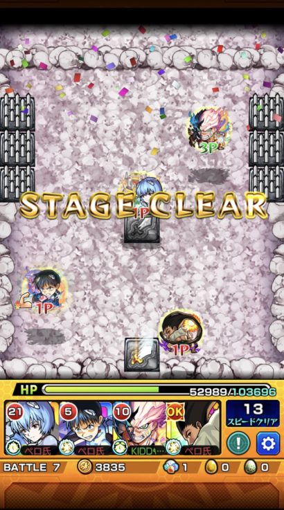 完全にレイの接待クエですな。他にはやはり殴りがメインのクエストではゴンさんが強いのね。思った以上にボスが固いので使徒キラーのあるレイ等のコラボキャラが大活躍なのは間違い無し。