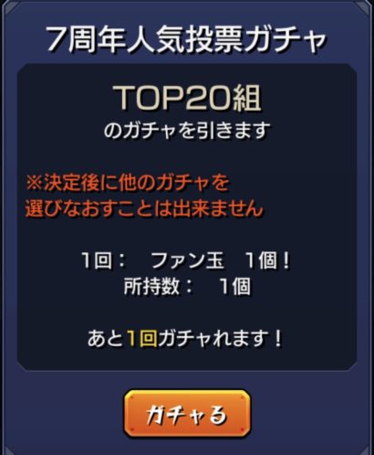 いよいよ待ちに待った7周年人気投票ガチャが実装されましたね。簡単に言えばユーザーが投票した上位100体がグループ分けされて、10連中最後の1体は選択したグループの中から必ず出ますよってガチャ。