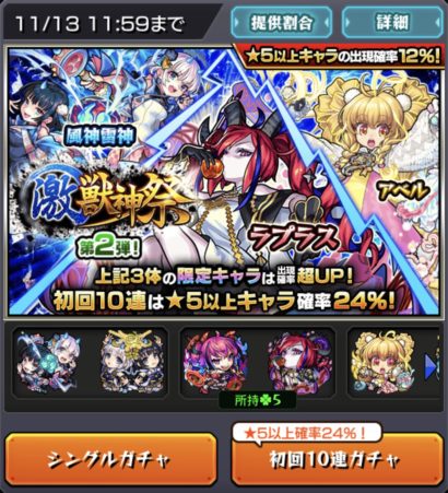 見事に風神雷神GET(゚∀゚) 24%らしい上振れはしませんでしたが後悔せずに済んで何よりって安堵感がデカいです。これで激獣神祭で未所持はアベルと閻魔のみとなりました。