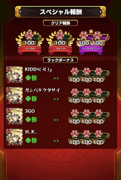 全員箱3、至宝+、スコア+が完璧に揃ってたので周回自体がウマウマでした。3時間弱でオラコインは全て集めて交換し終わったので開催中は常設クエな事もあり枠無しでメダル周回します。