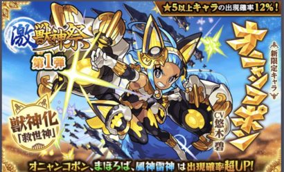 激獣神祭新限定オニャンコポン!しかし、スゲー名前だなw 全くここ最近は情報も仕入れる事が出来てないので、こいつが使えるのか否かは不明。取り敢えず今あるオーブで出なければ掻き集めてまで引く事はしないでしょう。