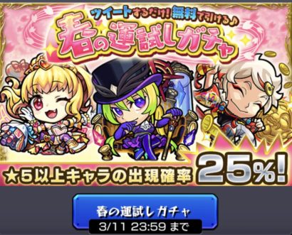 モンストの日限定なのかな?ツイートするとトク玉が貰えるキャンペーンが開催されています。目を引いたのは排出率。10日は25%、20日は50%、最終は75%と上がっていくそうです。