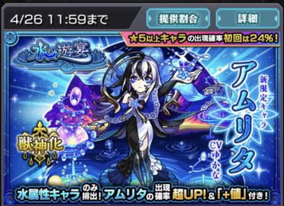 水の遊宴に新限定アムリタ実装!これはタイミング的に見ても完全に怪しい匂いしかしませんよね。禁忌は毎度追加される度に始めが火属性クエストとなっているので、もしかしたらこいつ刺さるのでは?なんて思ったり思わなかったり。