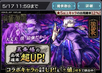 五条のピックアップと重なったのも引くタイミングとしては完璧。ある程度の情報が出た段階で対象キャラに順序を付けましたが、五条は複数体居ても良いなと判断したからです。次はワンパン枠の虎杖で最後は七海となりました。