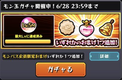 今月も無事に滞りなくモン玉ポイントが上限まで貯まったのでガチャを引く事に。たまにMAXまで貯まらずに諦めて中途半端なとこで引く人が居ますが、面倒なら1日1.2分で獣神玉クエでスタミナ消費するのが賢いかと。
