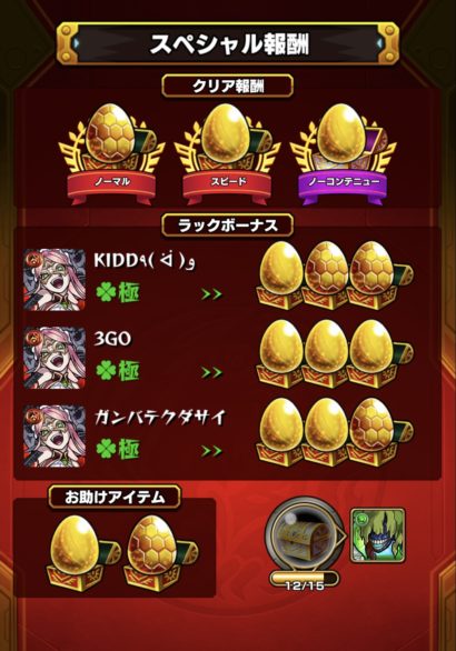 ソロで運1周回とかは流石に怠すぎるので早めに片付けたい人は初回降臨時から周りの人に混ぜて貰うと良いですよ。そこそこやってるユーザーなら3降臨目あたりで運極になる人が多いはずなので、そこを過ぎるとお手伝いして貰ったり便乗する機会は無くなります。勲章マニアなら喜んで手伝ってくれるかもw