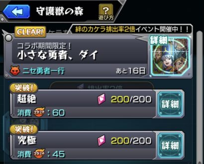 また、普段から高難易度が苦手って人はより守護獣を使った方が良いのでカケラを集める事は重要になります。コラボに限らずガチ勢やアクティブユーザーは行動が早いので、どのコンテンツも周りにその様な人が居れば開始と同時に混ぜて貰って便乗するのも手法としては賢いですよ。