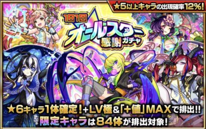 3日間限定オールスター感謝ガチャ実装!これに関しては感謝言うくらいなら無料で良くね?と毎度思ってしまう&1体確定ってだけでアゲインと違い限定が確定で出る訳では無いのが微妙。また、ビックリするくらい排出率も悪い事で有名なので完全にスルー。
