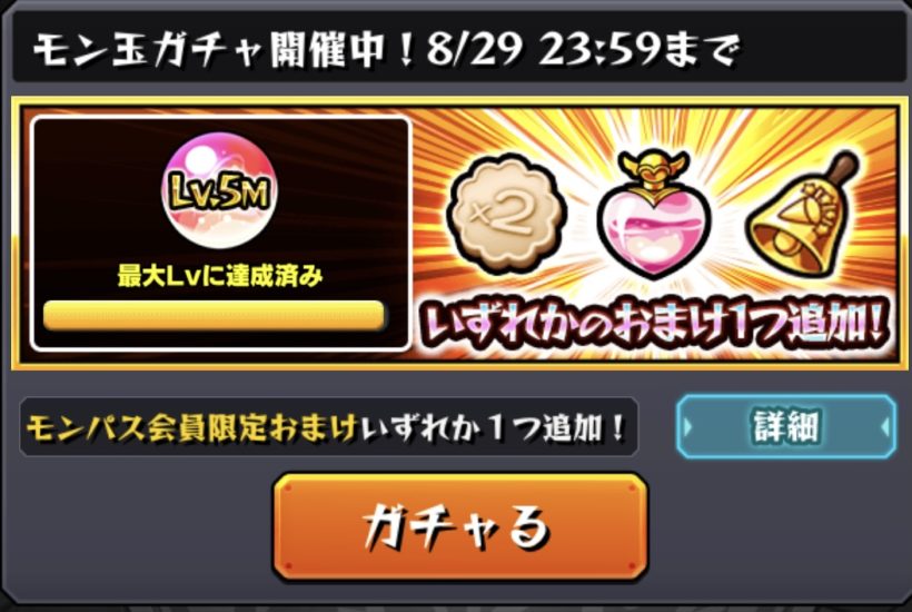 さて、今回は何が出ますかね。モン玉は相変わらず何が出ようとも何も思いません。期待するとガッカリするので。強いて挙げれば新規かラックが高めなキャラの被りが理想。