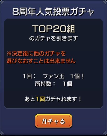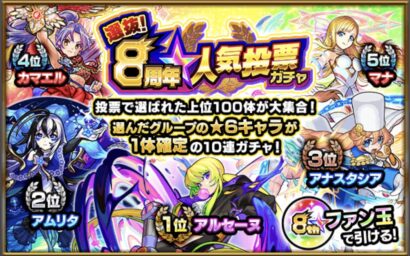前日の正午より8周年人気投票ガチャが実装されました。只ちに引きたい欲をグッと堪えて他の人の様子をYouTube等で観てから本番に臨む事に。ガチャに関しては切り替わり後直ぐに引いて余り良い思い出が無いので。