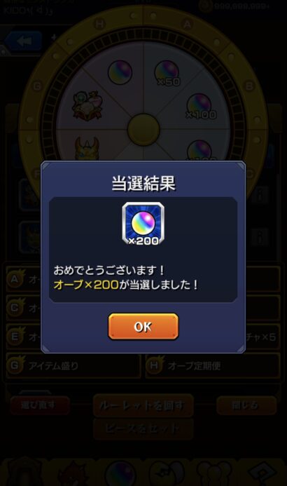 念の為にルーレットに法則的なものが無いのか検証をサブ垢で行いましたが、どうやら裏技的なものは無く完全に運のみっぽいです。果たして運はあるのか無いのか。当たりは定期便かオーブ200個ですが私の結果は…。