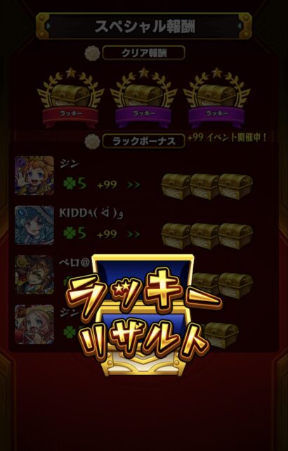 早速、周回しようかと思ったのですがこれに関しては周りの人とマルチする以外の選択肢はありません。更に相互でビスケットを出し合えば一気に複数体の厳選が可能なのでは?オマケに先程まではモンストの日だったのでタイムボーナスも倍。ベルを使えばノーコン報酬も倍。最大効率の厳選とか最高過ぎる。