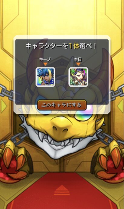 手始めに実装されたのが毎キープガチャ。何かと言うと読んで字の如く、13日間1日1回ガチャを回せて排出されたキャラをキープし続けられるイベントです。毎回どちらかを選択してキープ出来るのでなかなか面白い仕様かと。