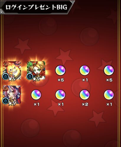 日付が切り替わると同時にログインプレゼントBIGなるものが実装されました。中身は至ってシンプル。ただ、ログインして受け取るだけ。ランダムでオーブと金卵が排出されるとの事。また、金卵からは限定も排出対象らしいですね。