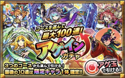 今年もやって来ました。毎年恒例のアゲインガチャが。モンストの中でも屈指の無料ガチャの一つですね。10連が何回続くかはランダムで限定が出ない限りは最大100連まで続くって仕様です。