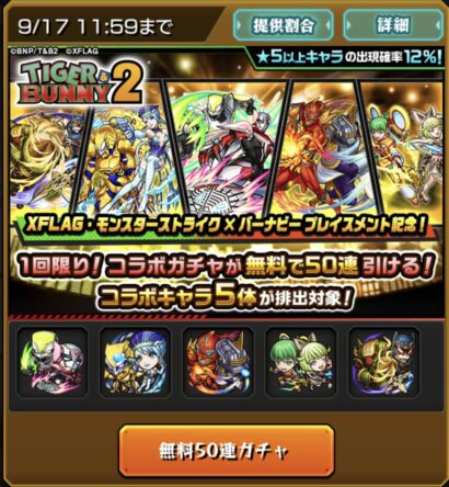 タイガー&バニーって何だ?全く分からないのでヤル気起きませんが唯一やるやんってなったのがコラボで初の無料50連ガチャの開催ですかね。