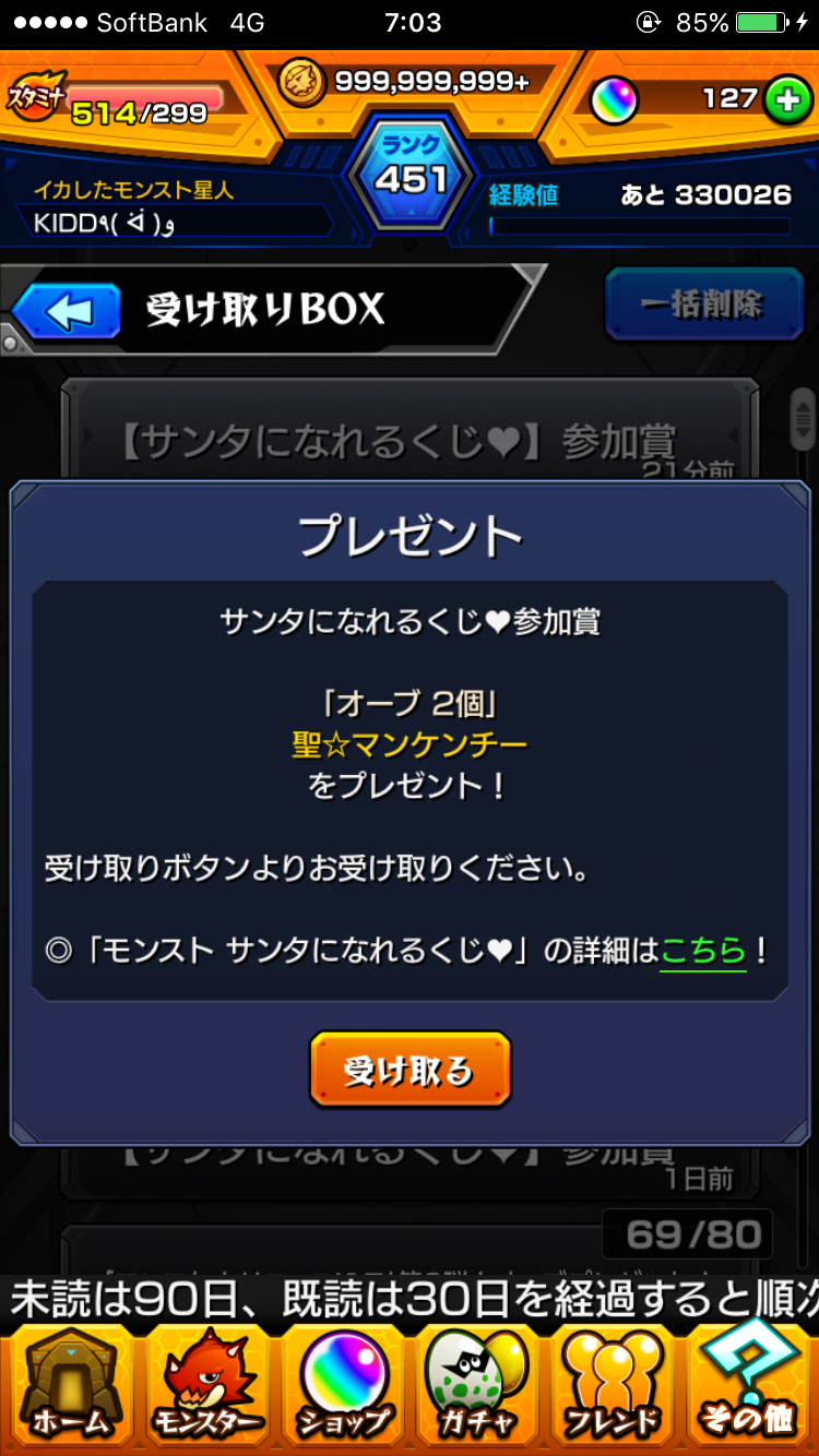 23.24.25日限定で「モンスト サンタになれるくじ」なるものが実装されています。どうやらログインした時にクジをタップすると豪華景品が当たるかハズレ枠の参加賞が当たるかの2択の模様。2日目の本日も早速引いてみると