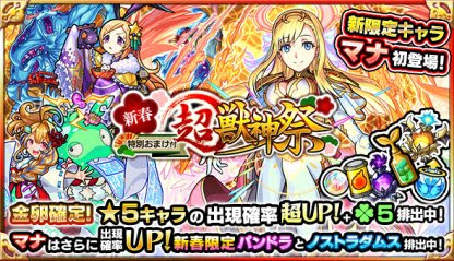 何と言っても今回の目玉は新限定キャラのマナでしょう。モンストはおおよそ半年に1度のペースで新限定キャラを出して来るのですがお正月に実装される限定は毎年かなり熱いので嫌でも気持ちが昂ります(^-^)