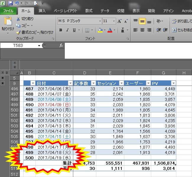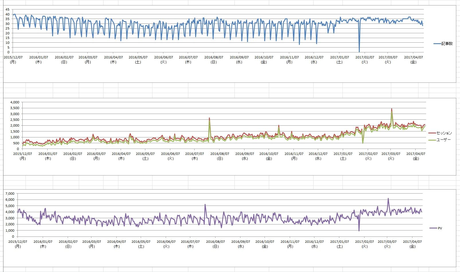 社員ブログ499日経過現在の、日々の記事数・セッション・ユーザー・PVグラフ