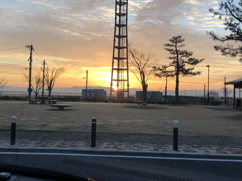 黒埼PAで朝日に見送られ