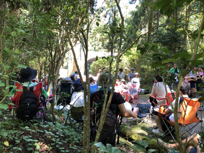 ステージ前はスタンディングゾーンですが、遊歩道(山道)の両脇には自前の一人がけチェア(キャンプなどの時に使う折りたたみ式のヤツ)が乱立状態で、なかなかいい場所が見つけられません。