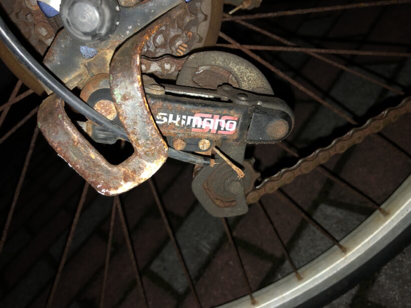 本当は左上から伸びている黒いカバーの中を通って手元のダイヤルまでワイヤーが繫がっているはずなんですけど、先日動きはじめに「ガツッ」て強めにペダルを踏みこんだら「ブチッ」と切れちゃいました。