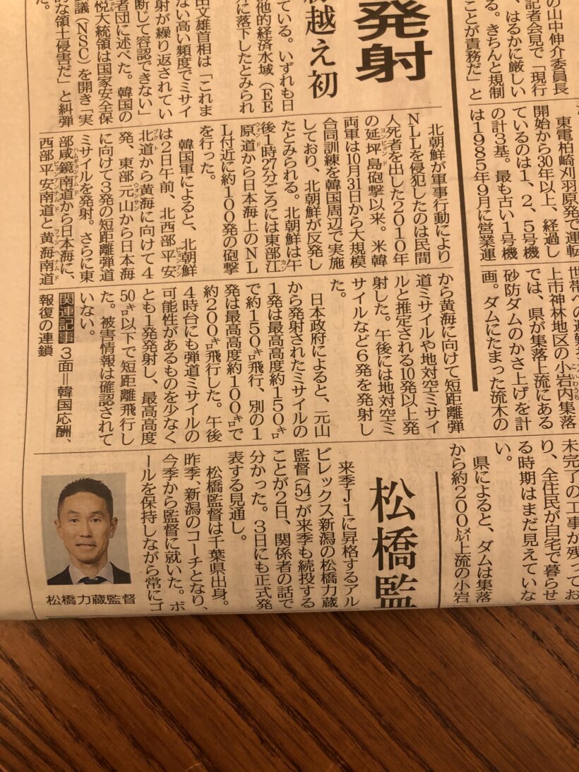 ちょうど折り目で見出しが全部見えなかったので「アルビレックス新潟の監督辞めるの?」って一瞬思ったんです。