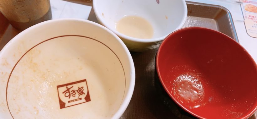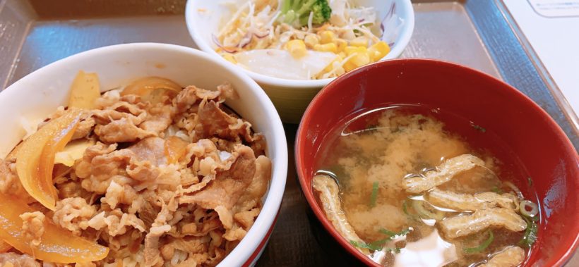 すき家の牛丼です。ここのお味噌汁私好きなんです〜、サラダもシャキシャキしてるし冷えてて美味しい!