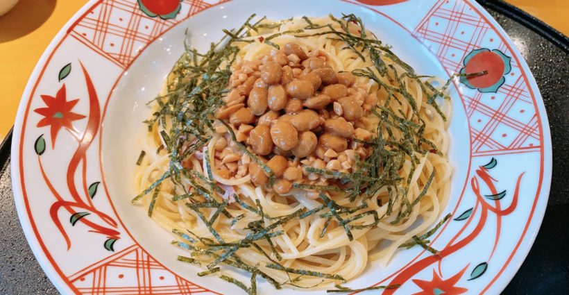 この納豆スパゲティー本当はネギと大葉が乗っているんですよ。