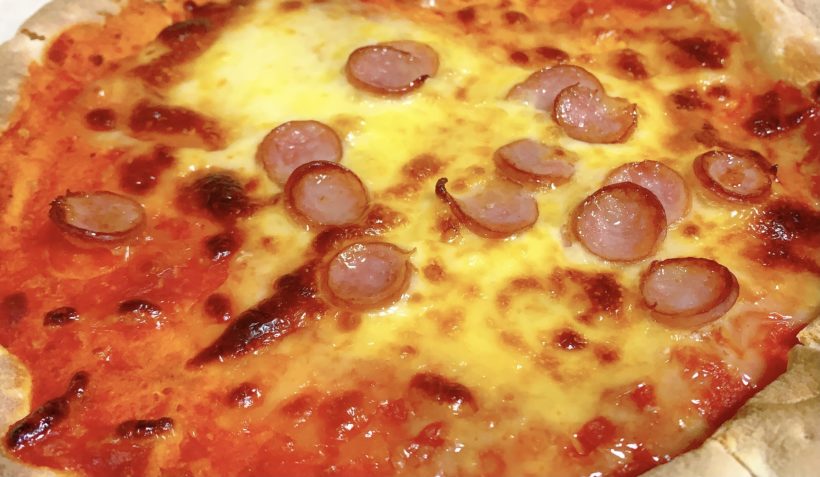 4枚に切り分けたんですけど、ちょうどソーセージが2枚に集中していて