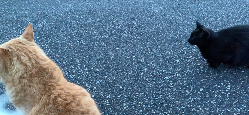 黒猫はめちゃくちゃビビりで、猫の本能を忘れていないような感じです。手前の君、もうちょい野生の本能を思い出そう。