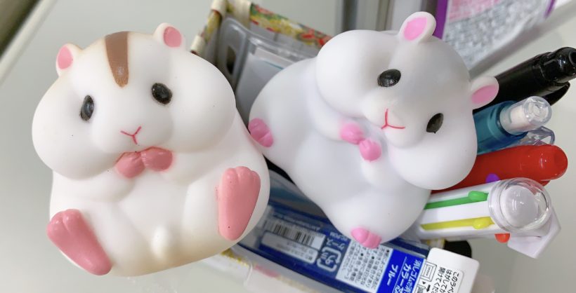 ハムのガチャガチャ300円で1回、少し前にスーパーで回しました。それが、左の茶色のハムスター。