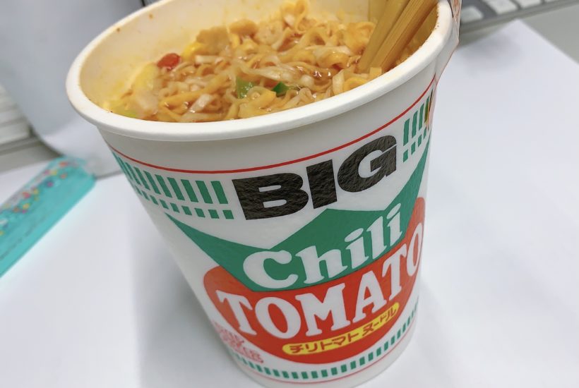 今日のお昼は、ずっと憧れてたカップヌードルのBIGサイズ〜いえーー!!!しかも大好きなチリトマト味!!